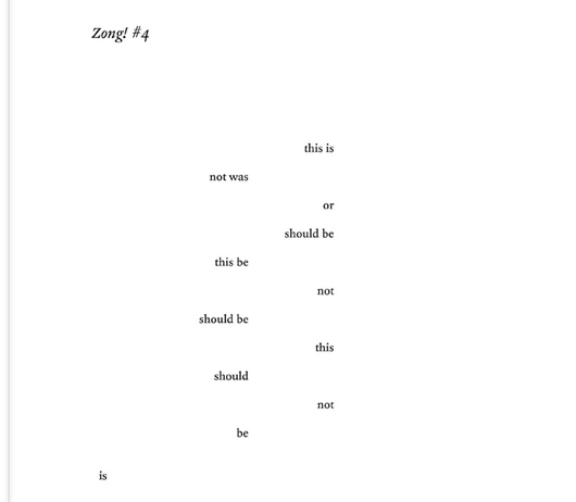 אני רוצה למצוא דרך להתנגדות, וחושבת על האופן שבו מעשה המחיקה יכול לשמש גם כצורה פואטית נוספת לספר סיפור של עדות. בספר ״Zong!״ מספרת המשוררת M. NourbeSe Philip את סיפור העבדים האפריקאים שהושלכו לטבוע בלב ים מאונייה בריטית בשנת 1781, ומשחזרת את האירוע דרך פירוק ומחיקה של תביעת הביטוח המקורית.[12] בשיריה, פיליפ חושפת את הדרך שבה השפה משתתפת בפשע, מוחקת את האנושיות של הקורבנות. המילים השבורות שנותרו אחרי המחיקה, הדפים הריקים כמעט לחלוטין של הספר, הופכים את קריאת שיריה לשחזור עקבות. בפואמה אחת, למשל, Zong! #4, נותרות על הדף רק קומץ מילים: